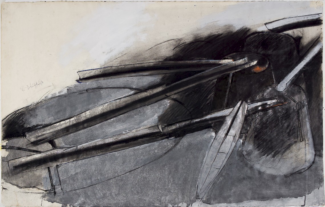 Kohle, Kreide, Gouache, Graphitpulver auf Karton