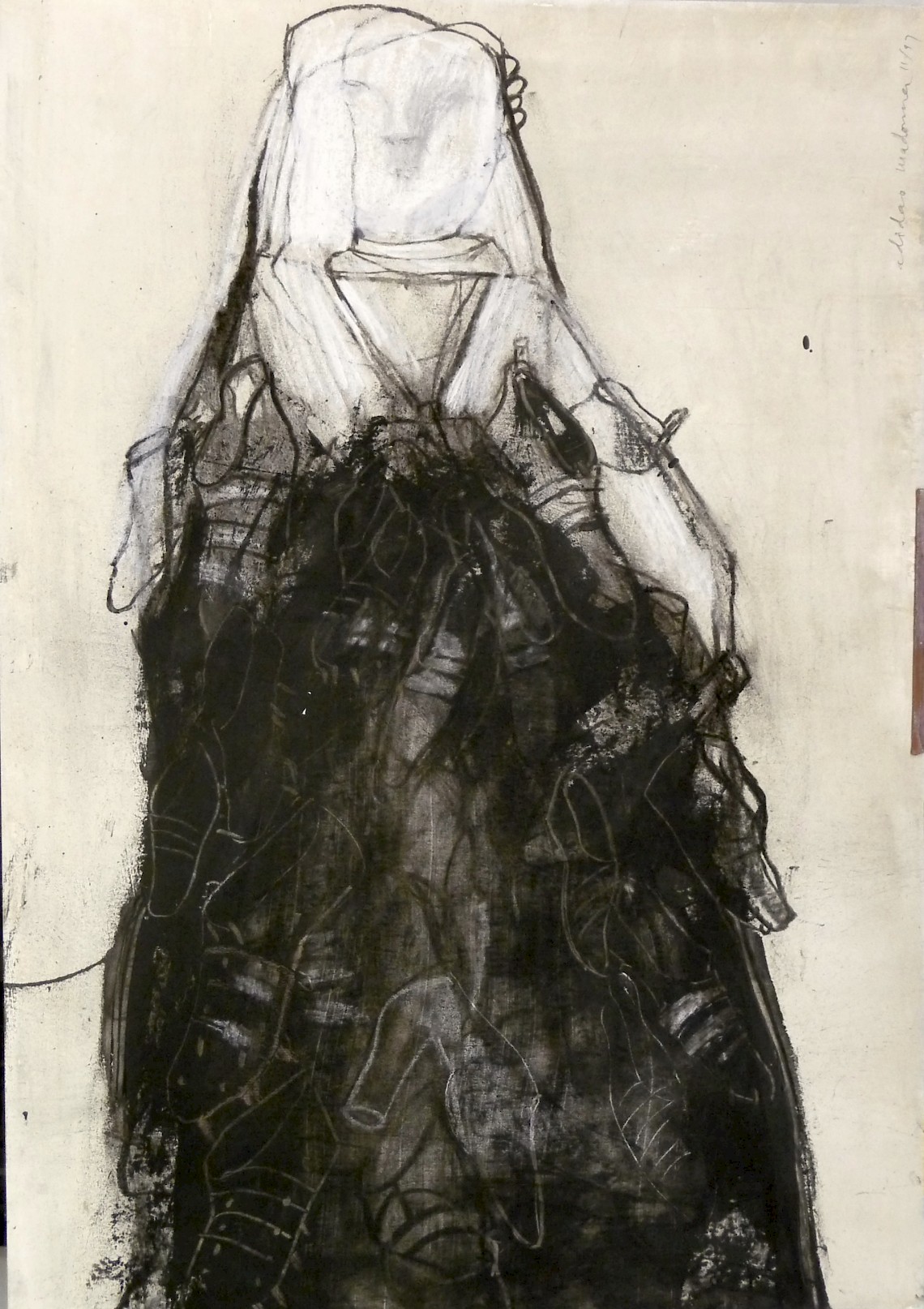 Kohle, Kreide, Acryl, Deckweiß auf Karton