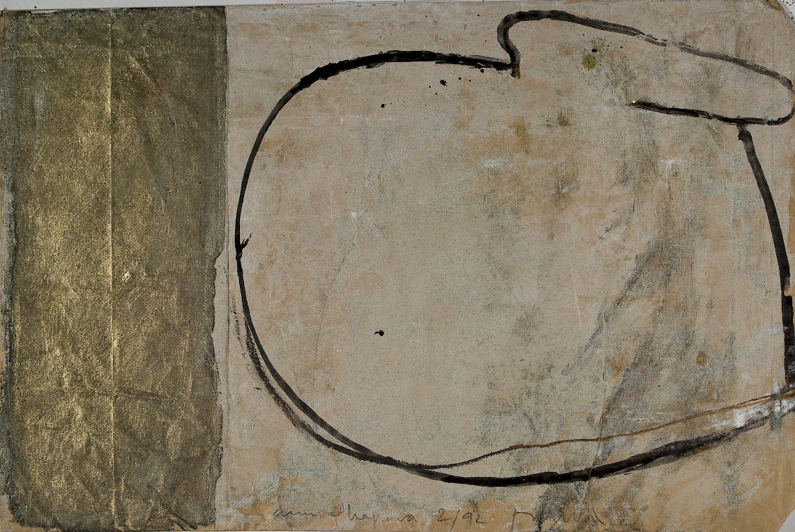 Goldpulver, Tusche, Farbstift, Deckweiß auf Papiertüte