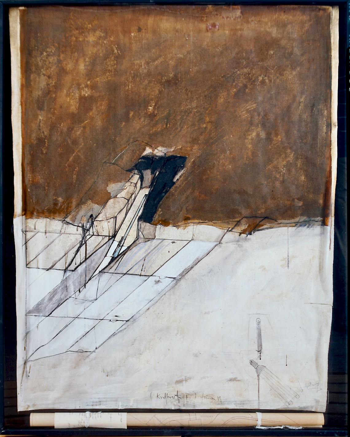 Kohle, Acryl auf getöntem Nessel (Papierplan des Kaukai-Dammes, gerollt im Objekt-Kasten)
