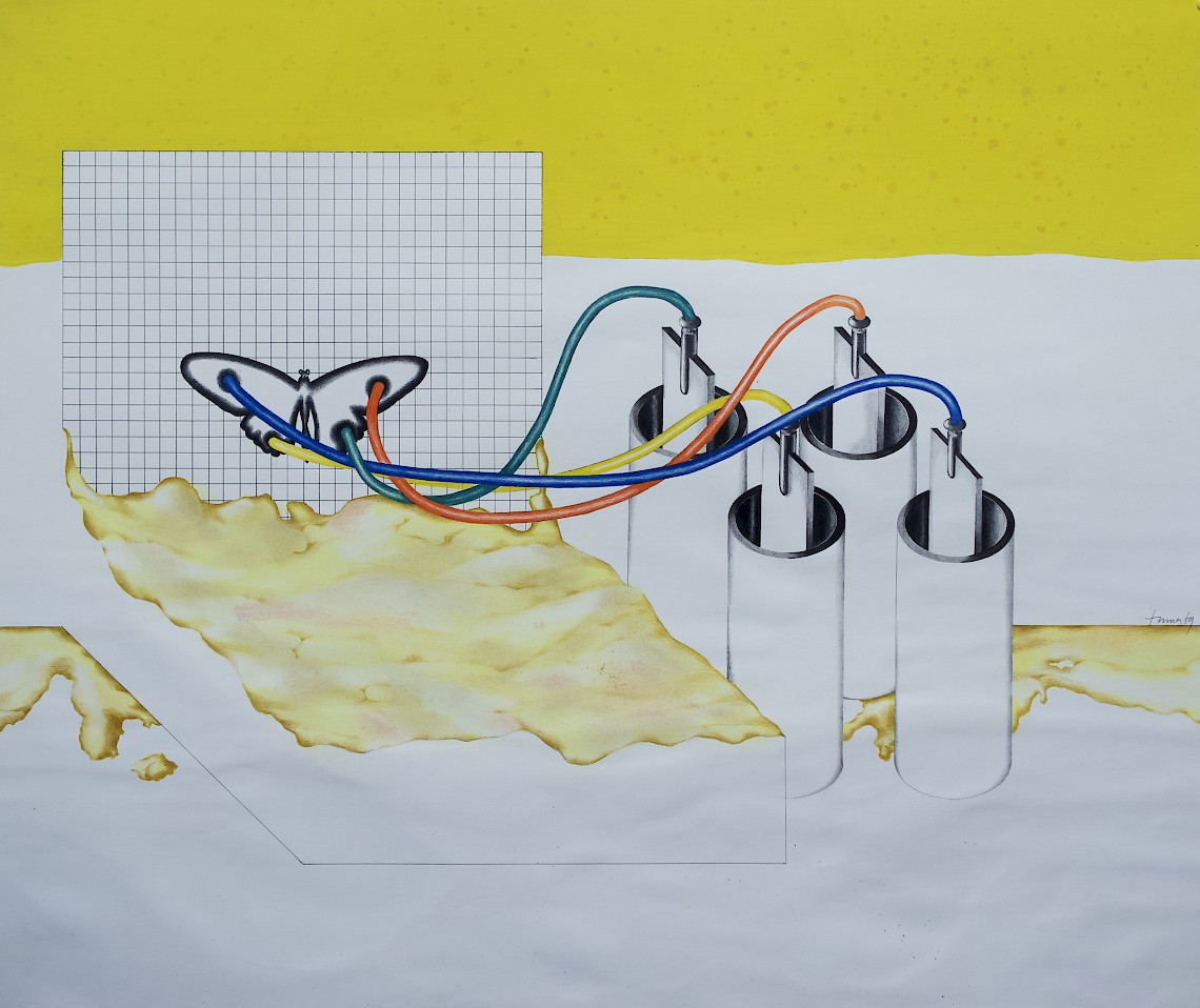 Bleistift, Farbstift, Pastell, Deckfarben auf Karton