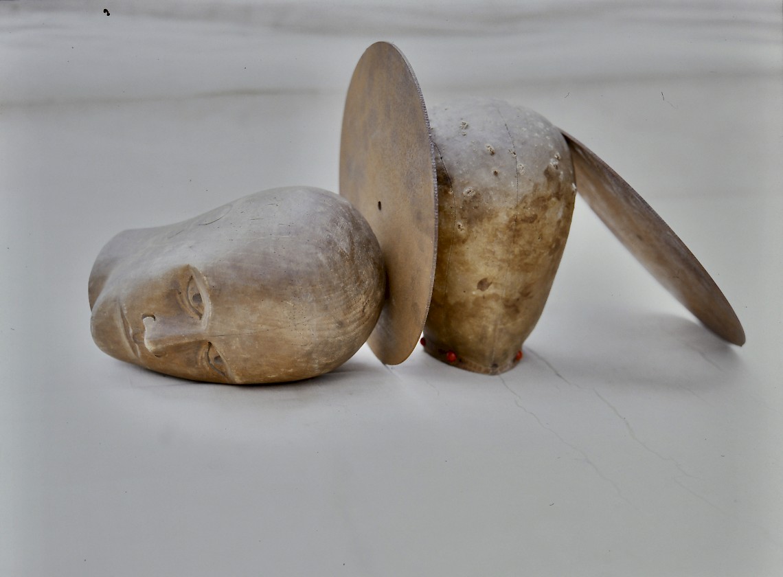 2 hölzerne Perücken-Köpfe, 2 Stahlscheiben