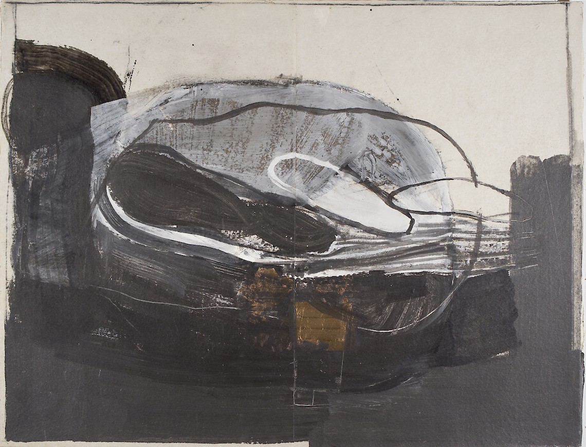 Gouache, Deckweiß, Tusche, Blattgold, Graphitpulver auf präp. Karton