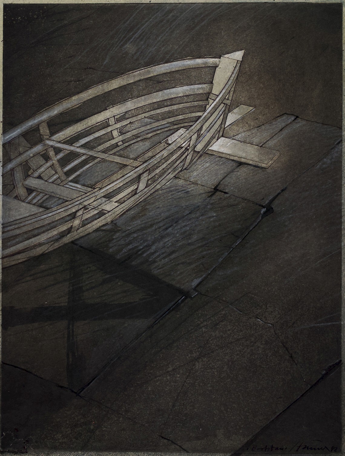 überarbeitete Radierung, Tusche, Kreide auf Radierbütten, 1980